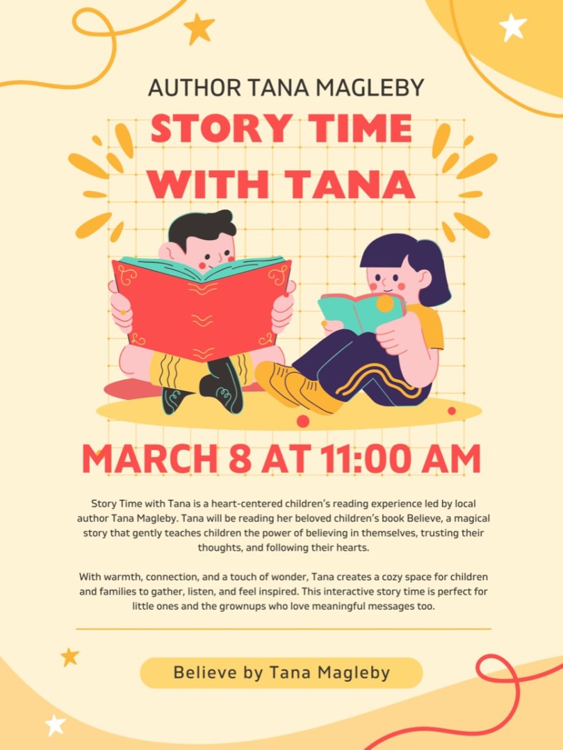 Story Time with Tana is a heart-centered children’s reading experience led by local author Tana Magleby. Tana will be reading her beloved children’s book Believe, a magical story that gently teaches children the power of believing in themselves, trusting their thoughts, and following their hearts.